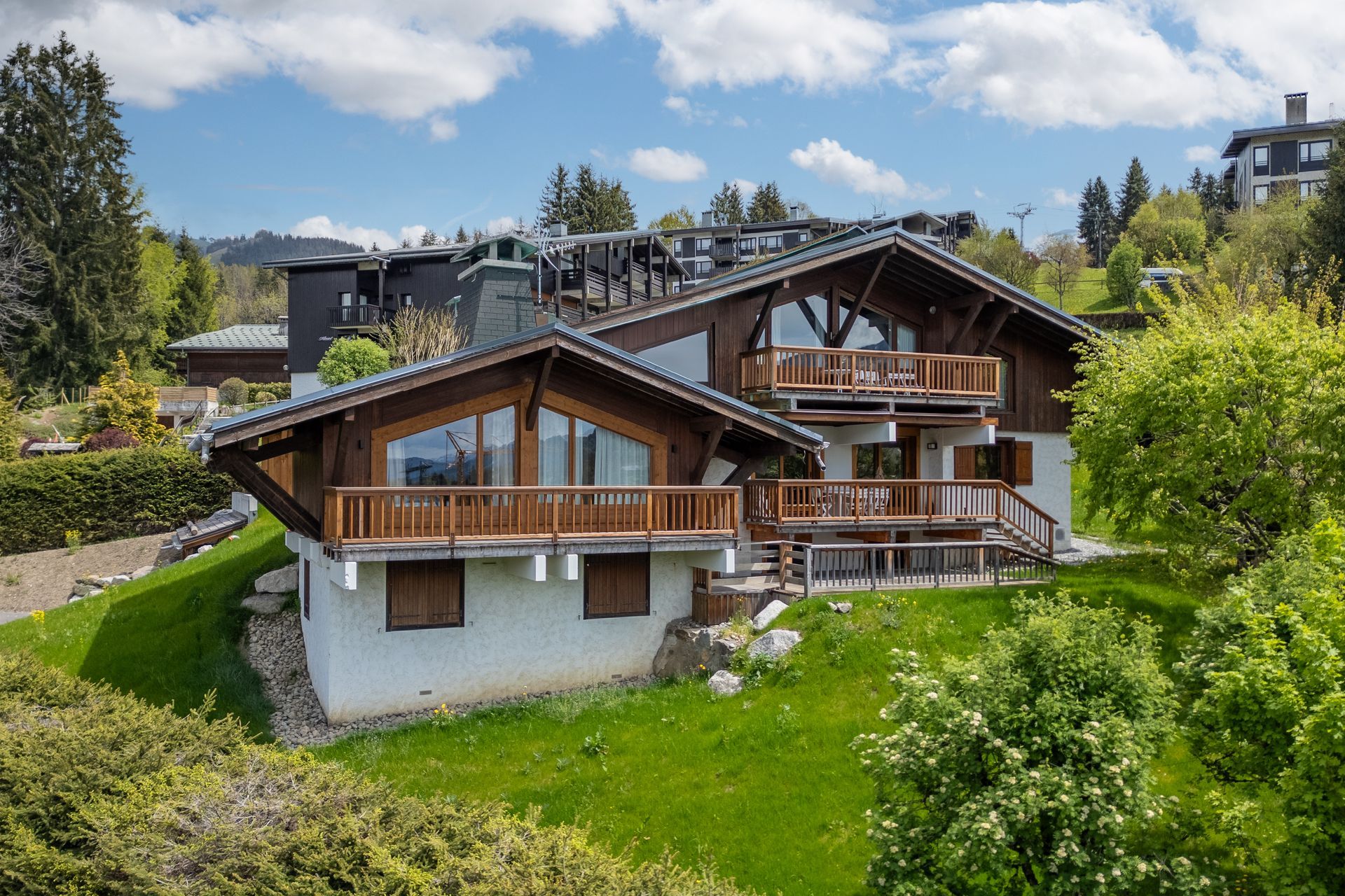 - Sur trois niveaux, deux logements, sept chambres, cinq salles de bains. En pièces de service une buanderie et un ski-room, en annexe un garage cinq places. Terrain de 1 328 m².